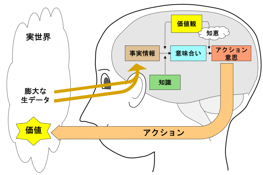 「青い空」のフレームワークも、価値創造に繋がる情報構造の確立に役立ちます。膨大に存在する生データから価値ある「事実情報」を収集し、過去の事実から得られる「知識」と「価値観」に基づき「意味合い」を抽出します。それと困難に直面すると、どこからか湧き出す「知恵」によって、「アクション意思」が選び取られます。各カテゴリーごとに、相応しい仕組みを設計します