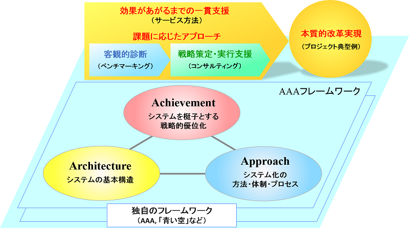 AAA、「青い空」フレームワークなど、弊社独自のフレームワークを活用し、様々な課題・解決策へのアプローチを行います