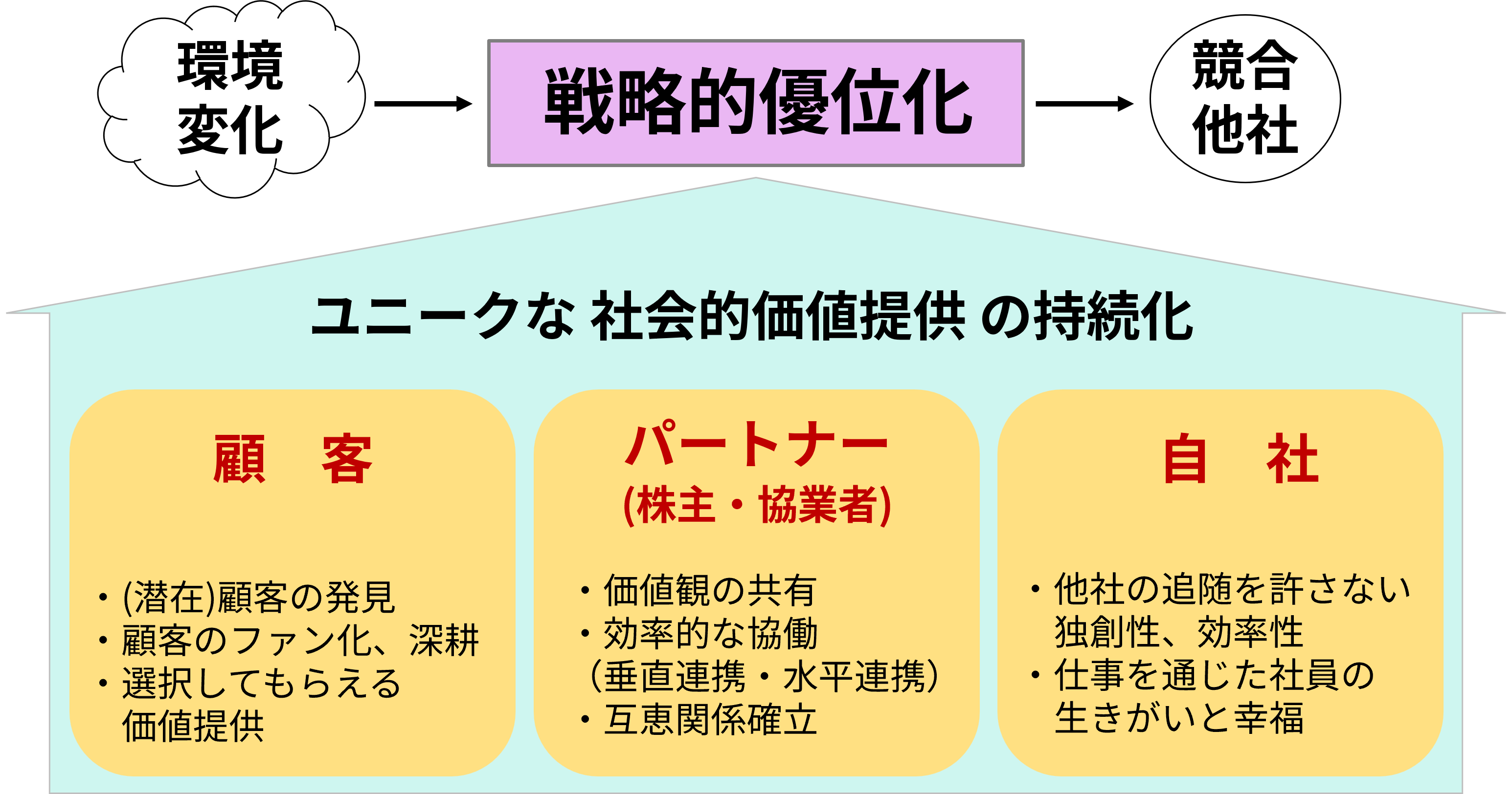顧客・パートナー・自社、それぞれの観点から、クライアント企業がユニークな社会的価値を持続するための戦略的優位化を実現し、21世紀の「いい会社」になるためのフレームワークとノウハウを提供します。