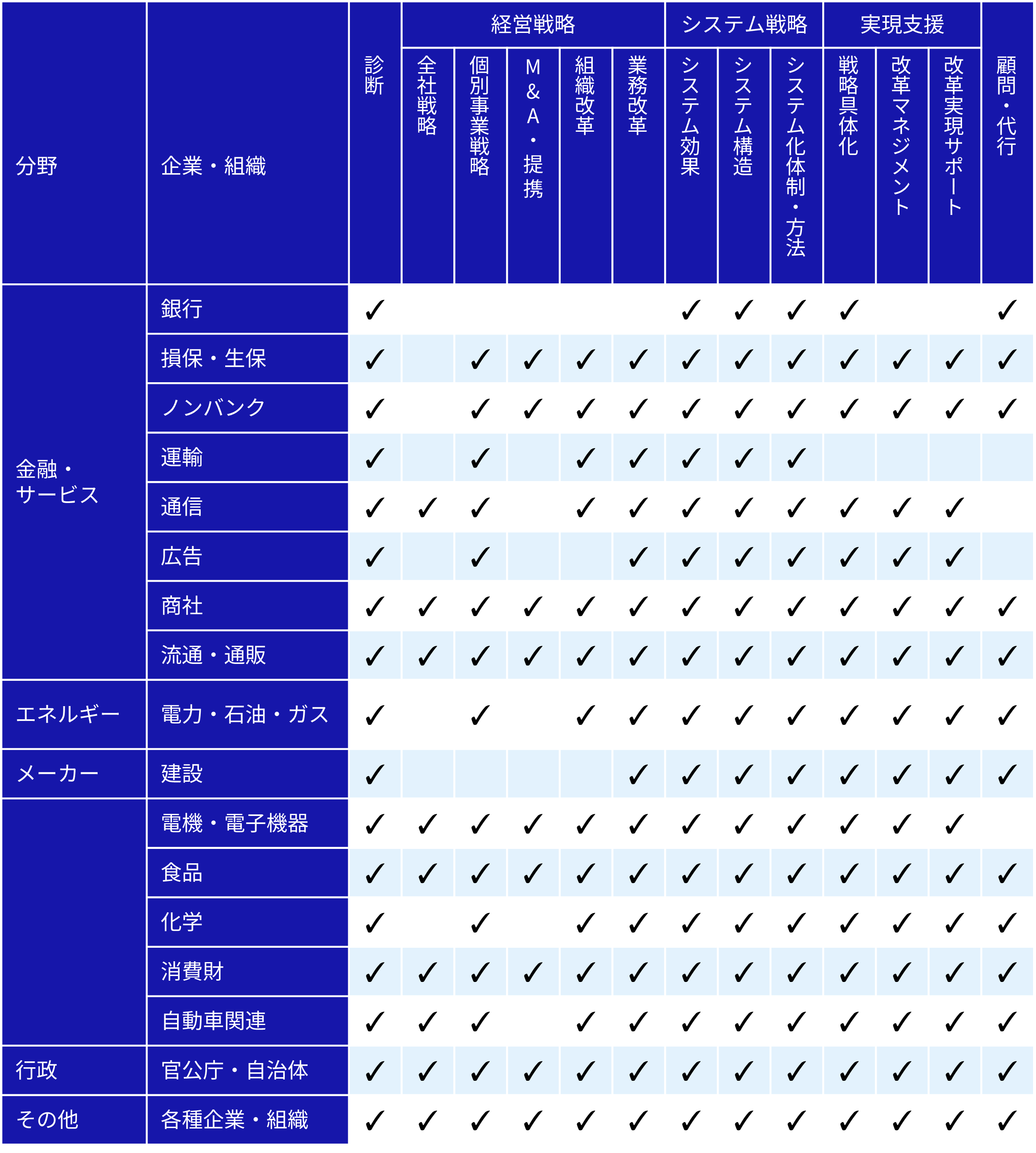 これまでのコンサルティング実績は、日本の主要業界のほとんどに及びます。1業種1社を基本として、各業界ごとに主に上位グループの企業から利害のコンフリクトが全く発生しない範囲で1~3社を顧客としています。コンサルティングとサポートサービスのテーマも、経営寄りからシステム寄りまでシームレスにカバーします