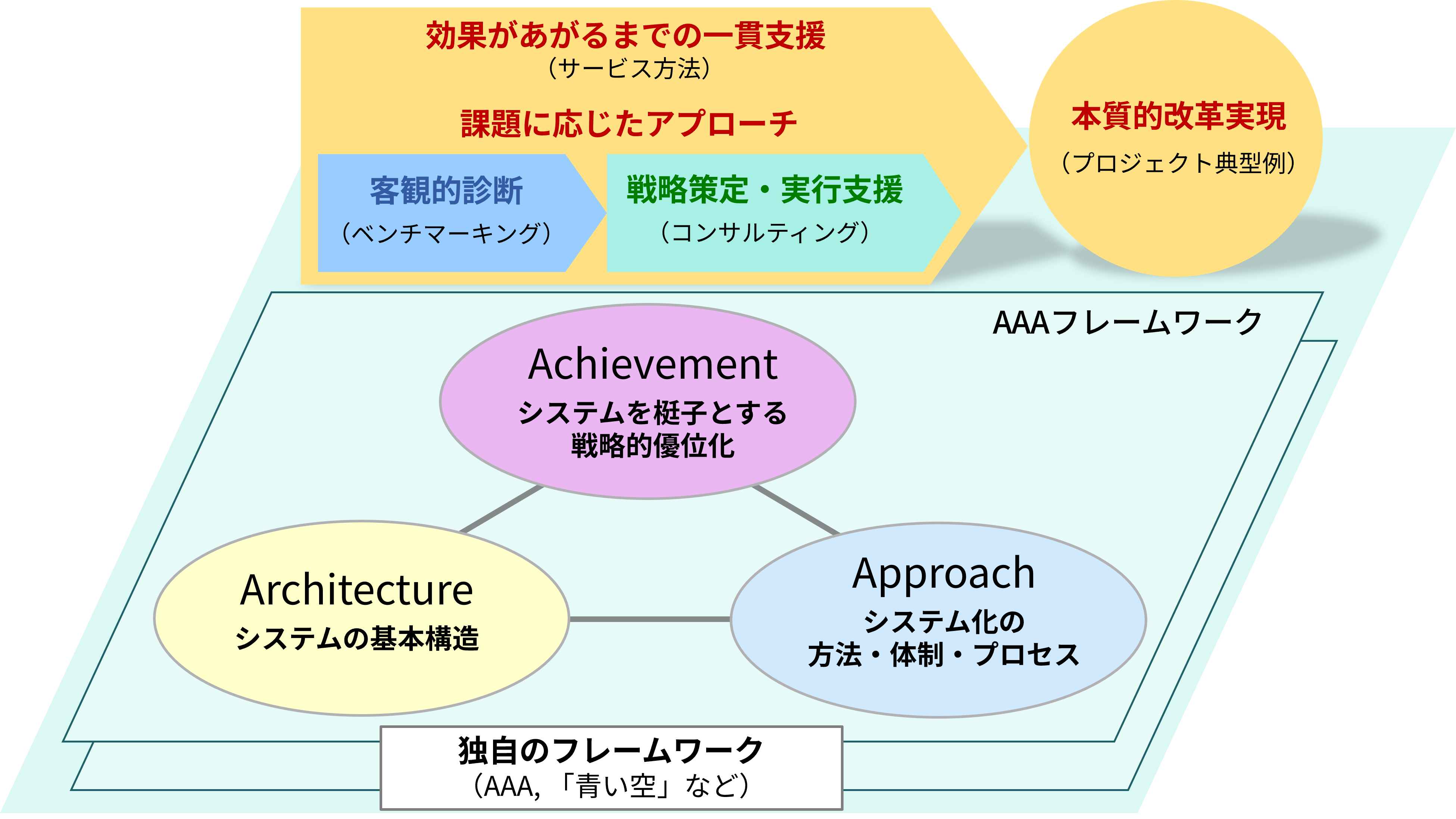 AAA、「青い空」フレームワークなど、弊社独自のフレームワークを活用し、様々な課題・解決策へのアプローチを行います