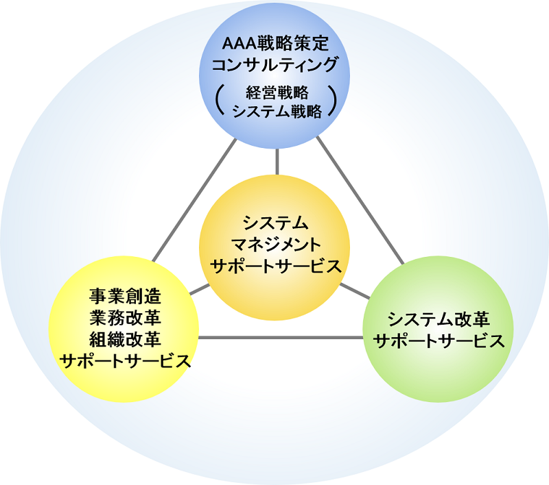 経営の視点から、AAA戦略の実現させるため、マネジメント診断から、事業創造、業務・組織改革およびシステム改革の各種計画、実行支援まで行います